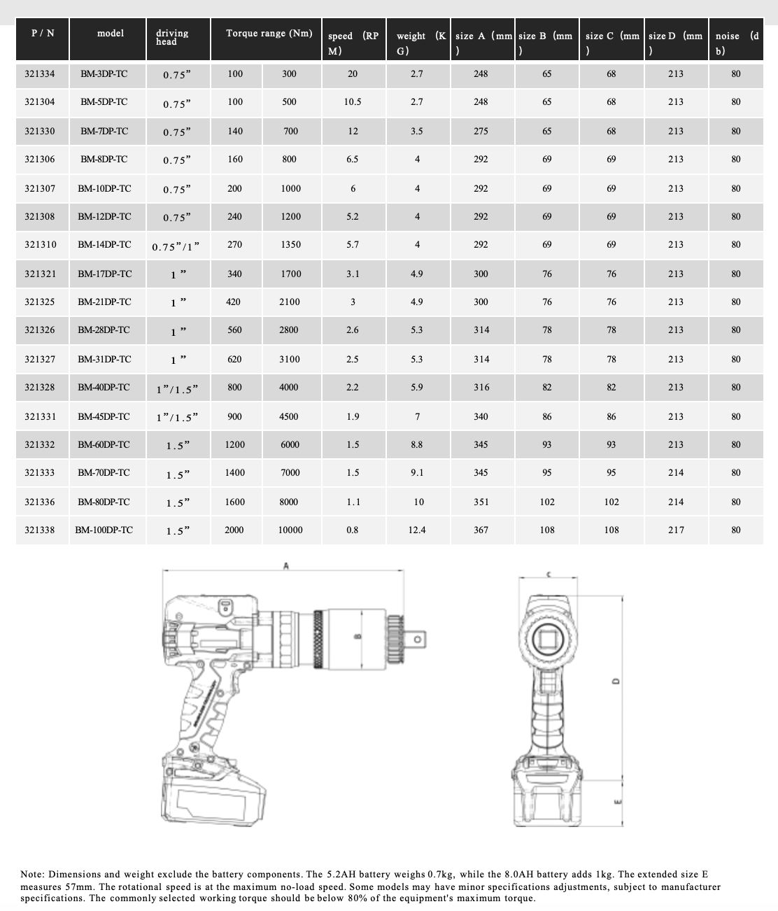 torque overload limit function High-capacity air-cooled battery, fast-charging charger Accuracy ±3%, repeatability ±2%